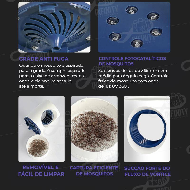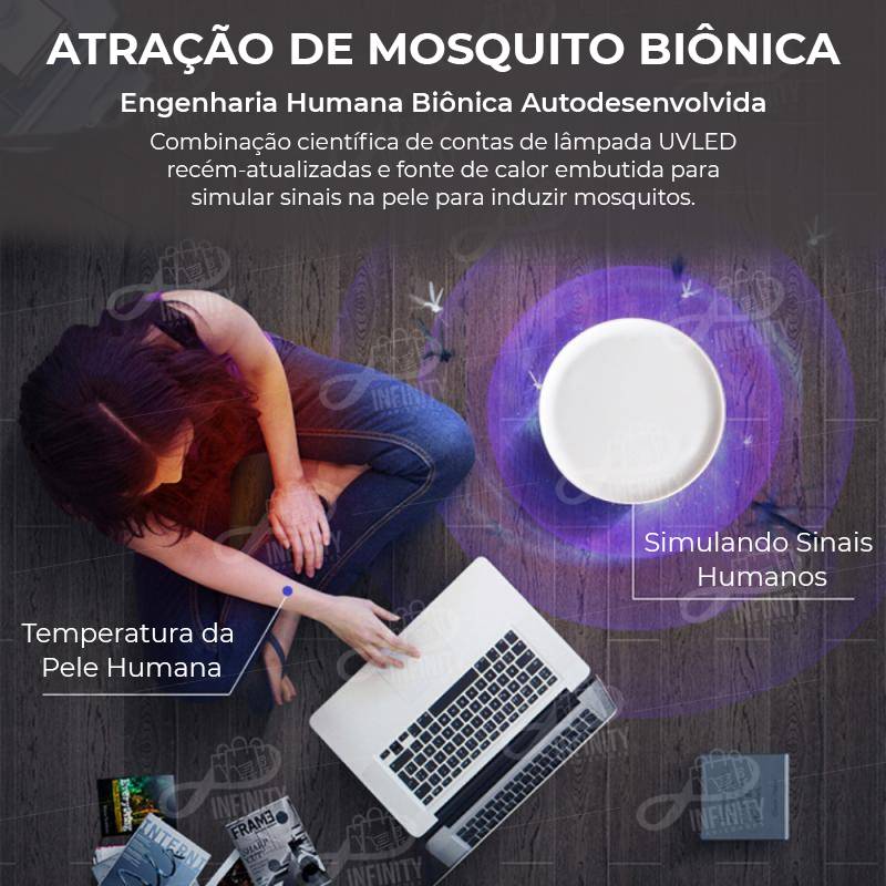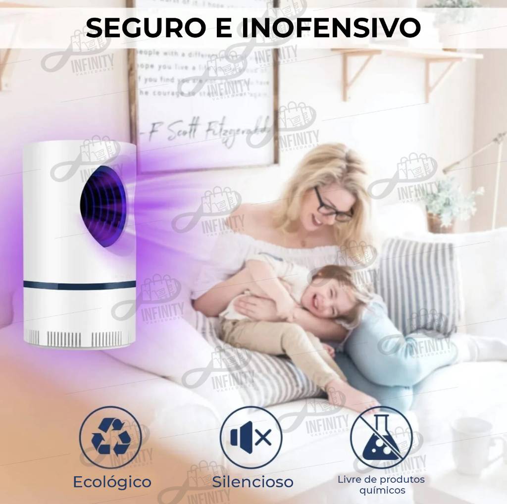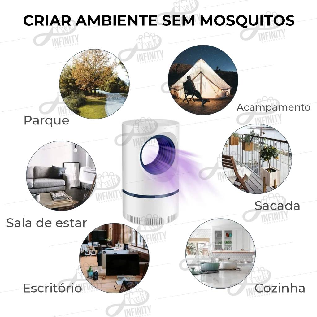 Atuando de forma extremamente silenciosa esse produto garante a eliminação da maior parte dos mosquitos de qualquer ambiente. Sem uso de produtos tóxicos e sem usar nenhum tipo de radiação, tornando-o assim um companheiro inseparável para qualquer hora e lugar.